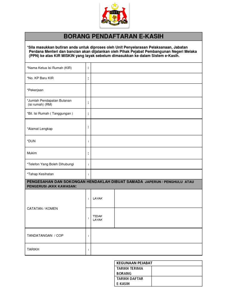 Muat Turun Borang E Kasih - s Carta De from lh3.googleusercontent.com Orang ramai perlulah memanfaatkan sistem pemberi bantuan yang diwujudkan dalam portal pembasmian kemiskinan dengan memaklumkan maklumat mengenai kemiskinan yang dihadapi dengan mengunakan borang permakluman ekasihsecara dalam talian. Khusus jurusan seni dan olahraga wajib upload portopolio. Salinan kad pengenalan ketua isi rumah. ( sent di whasap) gambar bank muka depan: Dapatkan borang pendaftaran spmu(jun) di kaunter jpn atau ppd. Proses selanjutnya adalah konfirmasi borang. Sila pastikan anda mengisi alamat penghantaran pada ruang yang betul dan tepat. Sila lengkapkan borang pendaftaran dengan betul dan pastikan setiap lajur di isi.